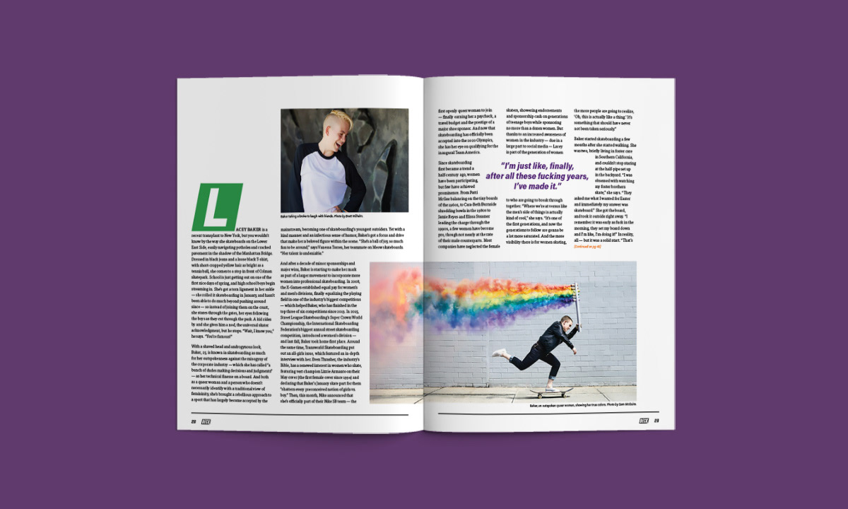 This fictitious magazine concept was designed to inform extreme sport enthusiasts between the ages of 16-30 on news, trends, and professionals in skateboarding. This is achieved with bold color and typography to draw in the reader and a clean layout to enhance flow and readability.
