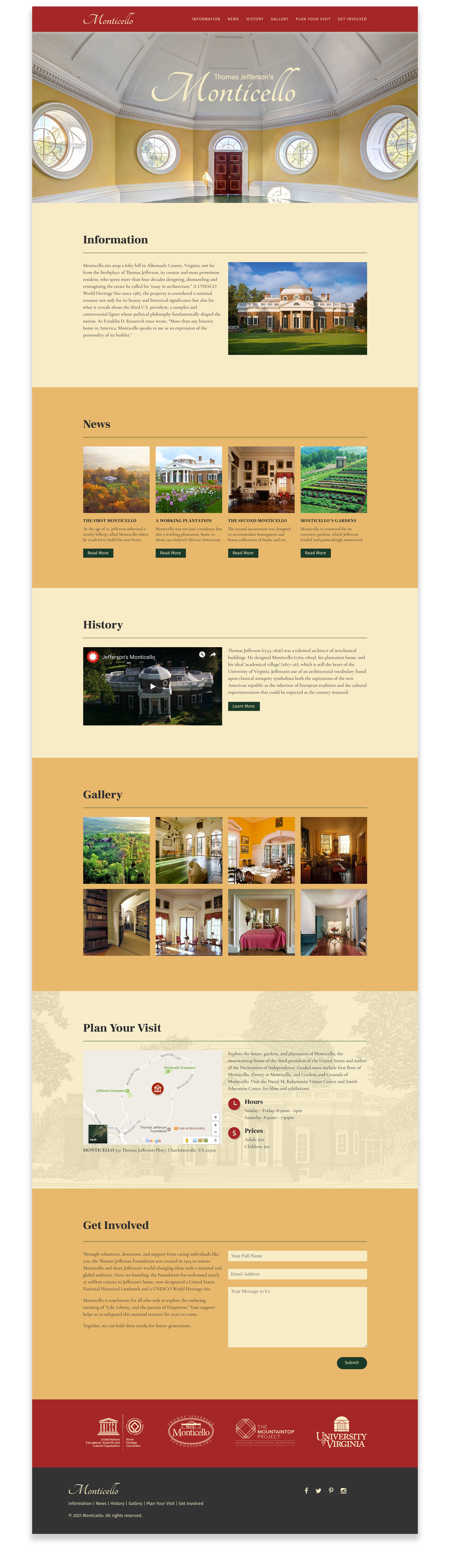 This fictitious website concept was designed to educate people between the ages 30-60 about Thomas Jefferson's home and UNESCO World Heritage Site, Monticello. This is achieved with a clean layout, a colonial color palette, and stunning imagery.